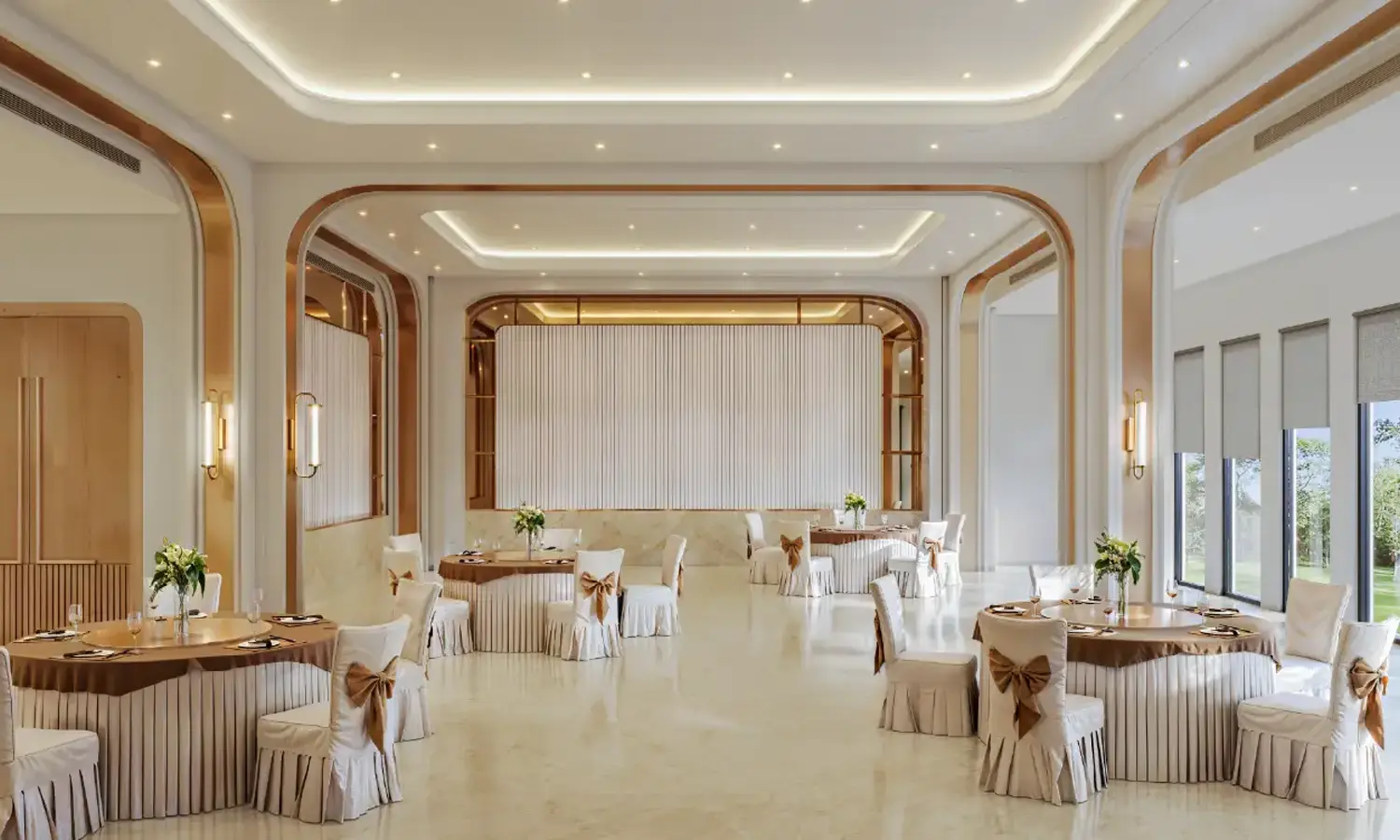 Lavish clubhouse surrounded by greens and landscaped zones.